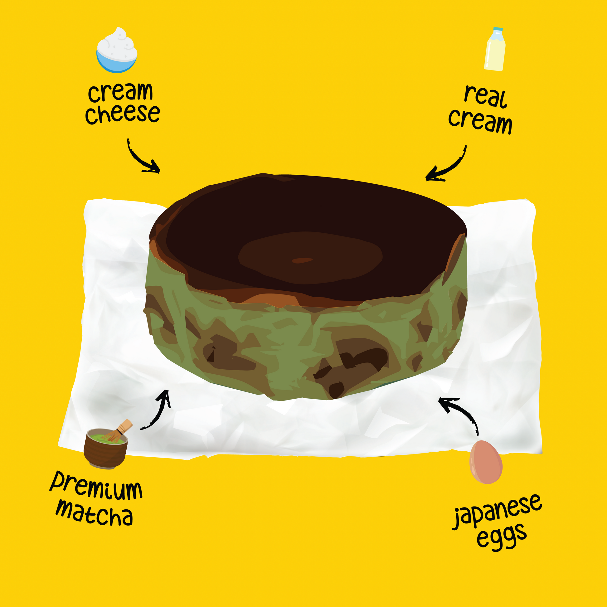 Our Matcha Burnt Cheesecake starts with the same quality ingredients in our Original Burnt Cheesecake—cage-free fresh eggs from Japan blended with fresh cream cheese and real double cream. Instead of vanilla beans, we've used ceremonial grade certified organic matcha from Shizuoka Prefecture, a region famous for its green tea production.